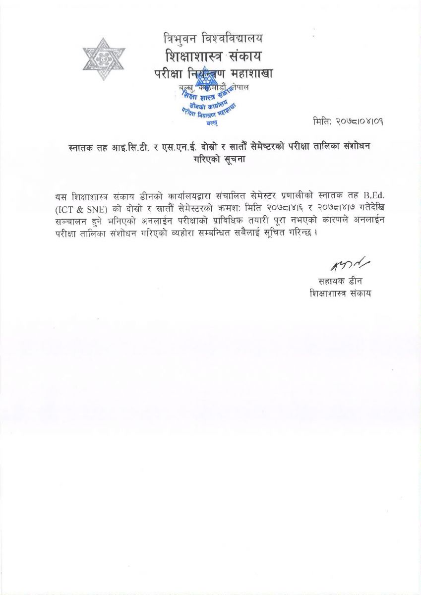 Tribhuvan University, Faculty of Education has postponed exams for Bachelor program's ICT and SNE exams of second and seventh semesters that were to be held from 6 and 7th Shrawan 2078 due to online exam technical preparations pending by TU. Now the online exams will be held from 10 Shrawan 2078 onwards from 11 till 12:30 P.M. on the basis of published exam routine as below: